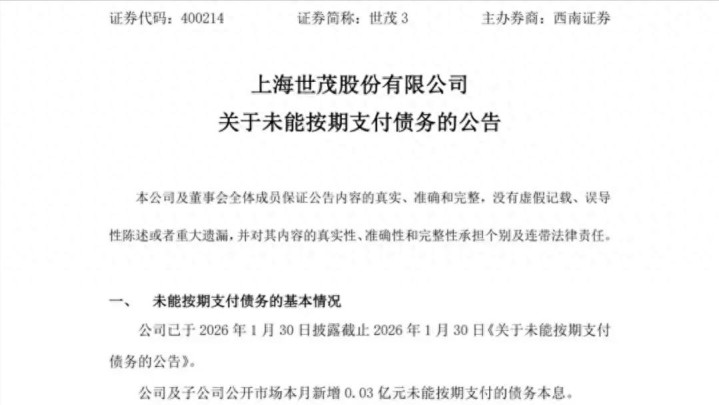 3月3日,上海世茂股份发布“关于未能按期支付债务的公告”,内容显示,2月份,公司及子公司公开市场新增0.03亿未能按期支付的债务本息。